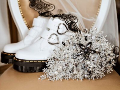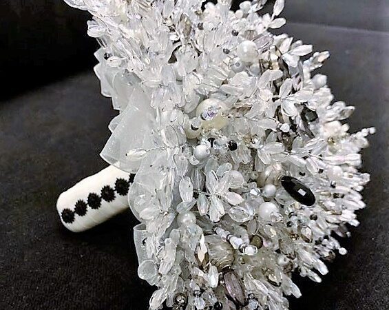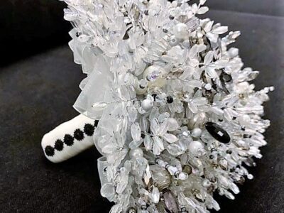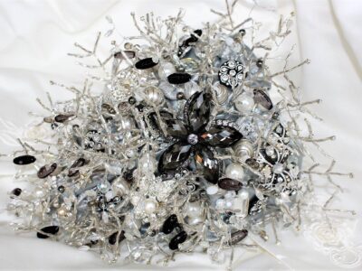 Bedazzle your guests with this stunning Black & Silver Bouquet. Created using sparkling brooches, embellishments, glass drops, crystals, buttons and lots of twisted bugle beads finished with diamante crystals, this dramatic brooch bouquet has an informal “teardrop” effect.