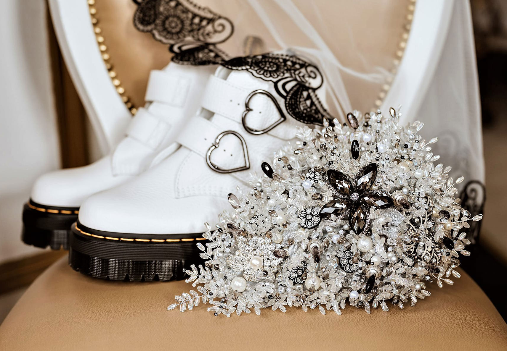 Bedazzle your guests with this stunning Black & Silver Bouquet. Created using sparkling brooches, embellishments, glass drops, crystals, buttons and lots of twisted bugle beads finished with diamante crystals, this dramatic brooch bouquet has an informal “teardrop” effect.